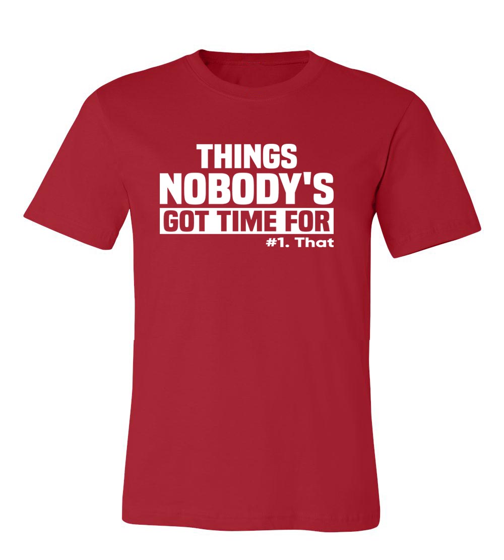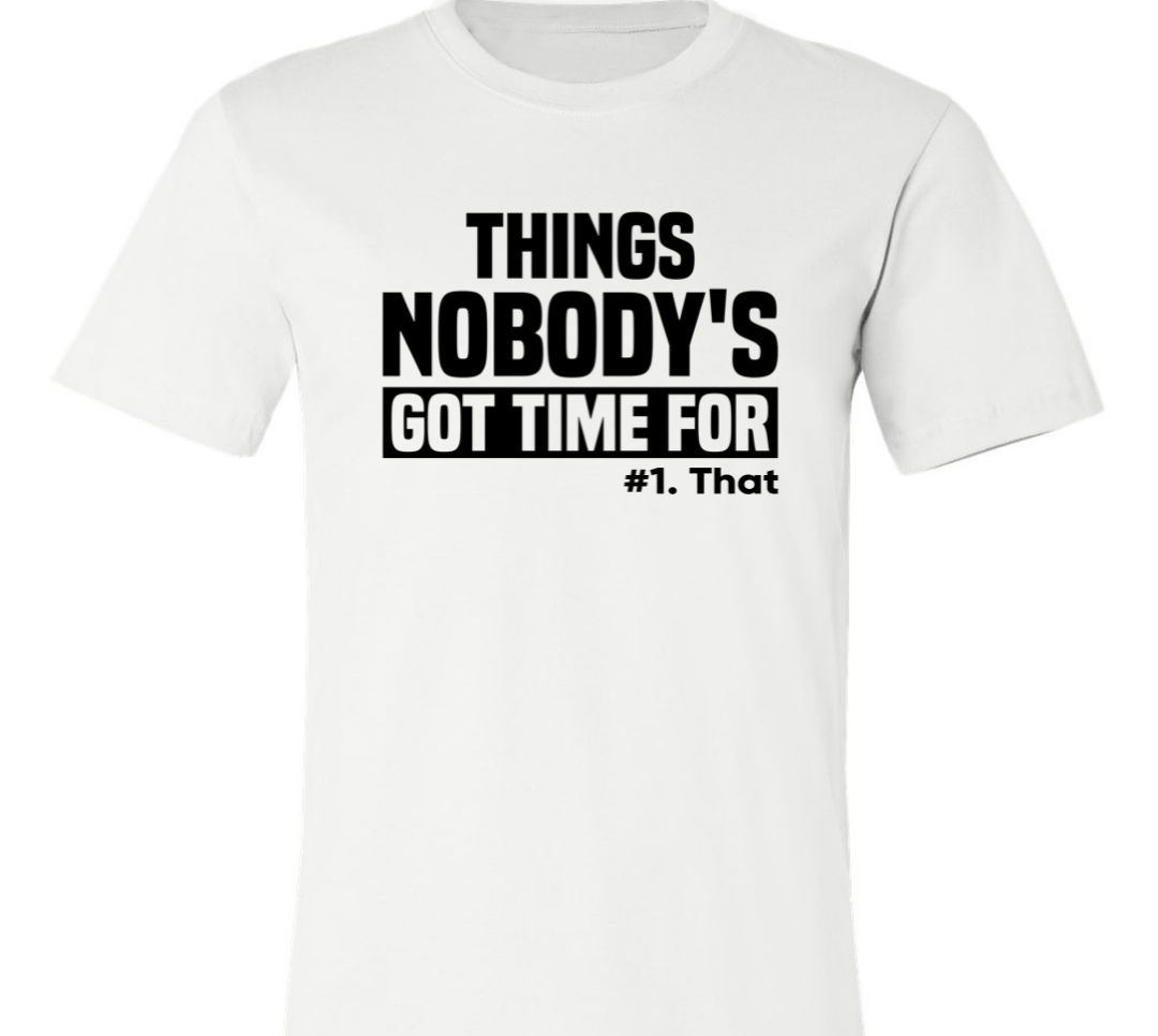 Our Things Nobody's Got Time For UNISEX tee is made from 100% ring spun cotton. The shirts are preshrunk, longer in length and width topped off with our bold, catchy statement.